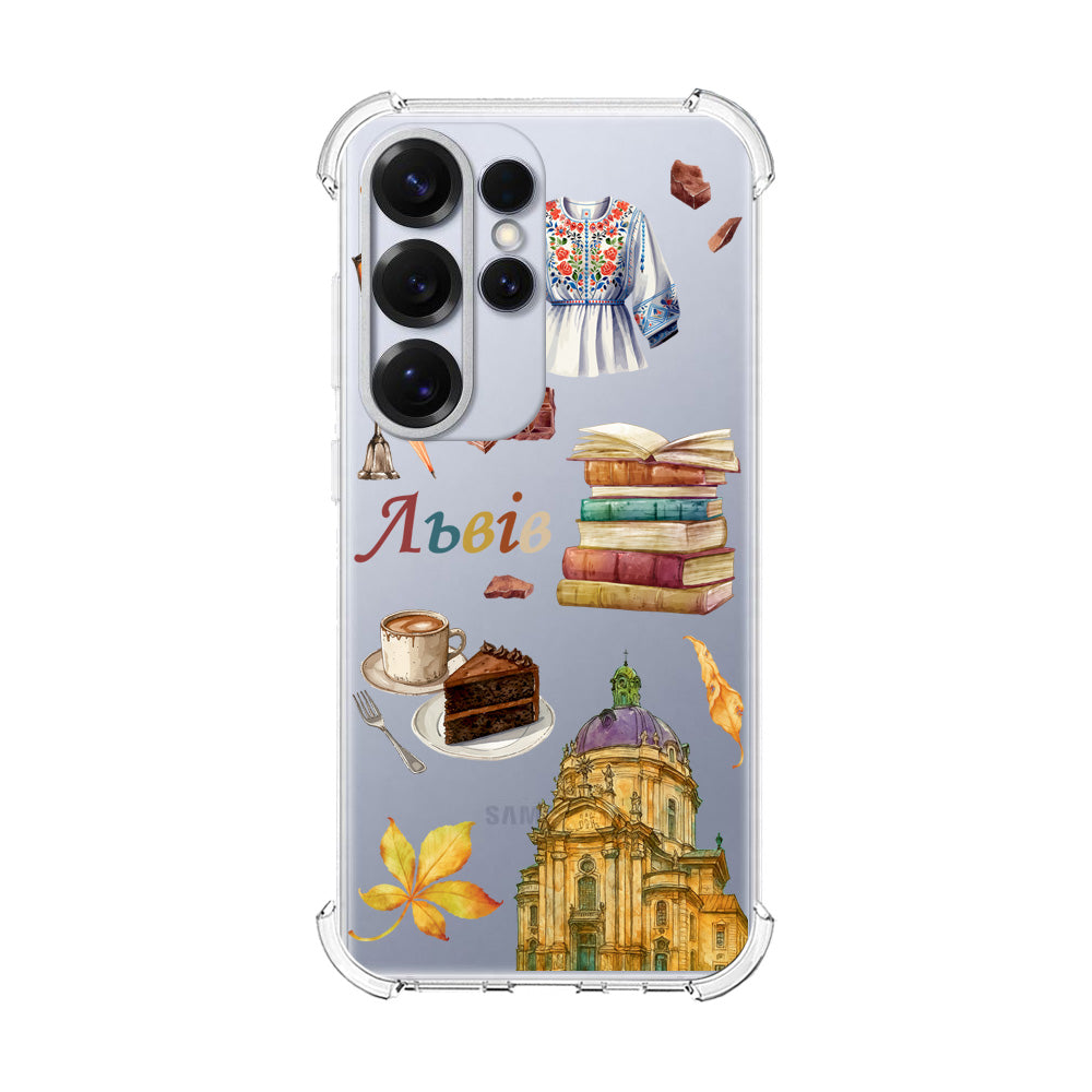 Чохол «Львів» для Samsung S25 — це справжня ода місту кави, дощу й тепла. Дизайн поєднує культові львівські символи — чашку ароматної кави, шматочок торта, старовинні книги та впізнаваний силует Домініканського костелу. Цей аксесуар передає атмосферу затишку, натхнення та спокою, яку так люблять шанувальники старовинного Львова.